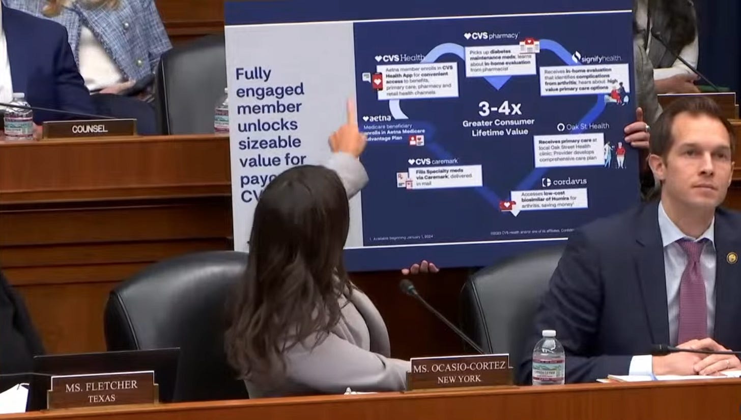 AOC: So the health insurance gets a cut, the pharmacy benefit manager gets a cut, the drug manufacturer gets a cut, and the patient gets screwed. I think the Federal Trade Commission has also found that health care conglomerates like CVS Health charge more for medications filled at their pharmacies.